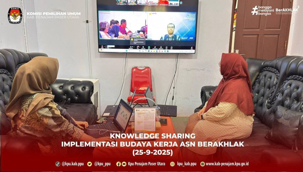 KPU Kabupaten Penajam Paser Utara Mengikuti kegiatan Zoom Knowledge Sharing Implementasi Budaya Kerja ASN BerAKHLAK pada Kamis, 25 September 2025. Kegiatan ini dilaksanakan dalam rangka penguatan budaya kerja ASN BerAKHLAK di lingkungan Sekretariat Jenderal KPU, Sekretariat KPU Provinsi, serta Sekretariat KPU Kabupaten/Kota. Kegiatan ini diikuti oleh Kasubbag Parhubmas dan SDM beserta staf bidang kepegawaian. Melalui kegiatan ini diharapkan menjadi momentum penting untuk meneguhkan komitmen ASN dalam menerapkan nilai-nilai BerAKHLAK sebagai dasar profesionalitas dan pelayanan publik yang berkualitas. #KPUmelayani ....