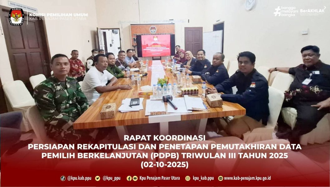 KPU Penajam Paser Utara Gelar Rapat Koordinasi Persiapan Rekapitulasi Pemutakhiran Data Pemilih Triwulan III Tahun 2025 Penajam – Komisi Pemilihan Umum (KPU) Kabupaten Penajam Paser Utara melaksanakan rapat koordinasi persiapan rekapitulasi dan penetapan pemutakhiran data pemilih berkelanjutan Triwulan III Tahun 2025 pada Kamis, 2 Oktober 2025. Kegiatan tersebut berlangsung di ruang rapat KPU Penajam Paser Utara. Rapat koordinasi dibuka langsung oleh Ketua KPU Penajam Paser Utara, Bapak Ali Yamin Ishak, didampingi oleh jajaran komisioner dan sekretariat KPU. Hadir dalam kegiatan ini perwakilan dari Dinas Kependudukan dan Catatan Sipil (Dukcapil), Polres Penajam Paser Utara, Kodim 0913 PPU, Badan Kesatuan Bangsa dan Politik (Kesbangpol), serta Badan Pengawas Pemilu (Bawaslu) Penajam Paser Utara. Melalui rapat koordinasi ini, KPU Penajam Paser Utara berharap seluruh pihak terkait dapat memberikan masukan dan dukungan penuh, sehingga proses rekapitulasi data pemilih berkelanjutan dapat berjalan lancar dan transparan. #KPUmelayani ....
