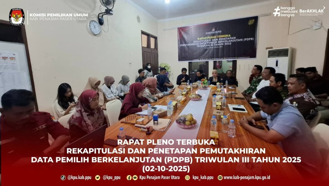 KPU Penajam Paser Utara Gelar Rapat Pleno Terbuka Rekapitulasi Pemutakhiran Data Pemilih Triwulan III Tahun 2025 Penajam – Komisi Pemilihan Umum (KPU) Kabupaten Penajam Paser Utara menggelar Rapat Pleno Terbuka Rekapitulasi dan Penetapan Pemutakhiran Data Pemilih Berkelanjutan Triwulan III Tahun 2025 pada Kamis, 2 Oktober 2025. Kegiatan berlangsung di ruang rapat KPU Penajam Paser Utara. Rapat dibuka secara resmi oleh ketua KPU Penajam Paser Utara, Bapak Ali Yamin Ishak Kegiatan tersebut dihadiri oleh berbagai pemangku kepentingan, di antaranya perwakilan Kepolisian Resor Penajam Paser Utara, Komando Distrik Militer (Kodim) 0913 PPU, Dinas Kependudukan dan Catatan Sipil (Disdukcapil), Kesbangpol serta Badan Pengawas Pemilihan Umum (Bawaslu) Penajam Paser Utara. Melalui rapat pleno terbuka ini, KPU Penajam Paser Utara berharap sinergi dan koordinasi dengan seluruh pihak terkait terus terjalin, sehingga kualitas daftar pemilih dapat terjaga dan proses demokrasi di daerah berjalan dengan baik. #KPUmelayani ....