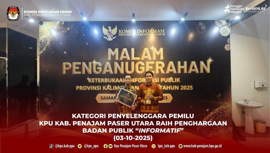 Penajam - Ketua Komisi Pemilihan Umum (KPU) Kabupaten Penajam Paser Utara (PPU), Ali Yamin Ishak bersama Ketua Divisi Sosdiklih, Parmas dan SDM, Aris menghadiri acara Malam Penganugerahan Keterbukaan Informasi Publik Tahun 2025 yang diselenggarakan oleh Komisi Informasi (KI) Provinsi Kalimantan Timur (Kaltim), pada Jumat (3/10/2025). Acara tersebut merupakan penghargaan atas tranaparansi informasi tiap lembaga publik yang ada di Kaltim melalui e-Monev yang dilakukan oleh KI Kaltim. Pada tahun 2025, KPU Kabupaten Penajam Paser Utara mendapat predikat Informatif sebagai lembaga publik dibidang penyelenggaraan pemilu di Kabupaten/kota yang ada di Kaltim. "Alhamdulillah tahun ini kita mendapat kualifikasi Informatif dari penilaian hasil emonev KI Kaltim. Semoga kedepan kita bisa menjadi lebih baik lagi dan bisa mendapat kategori terbaik," ujar Ali Yamin. Untuk diketahui, Acara penghargaan tersebut dilaksanakan di Pendopo Odah Etam komplek kantor Gubernur Kaltim, Samarinda. (*) #KPUmelayani ....