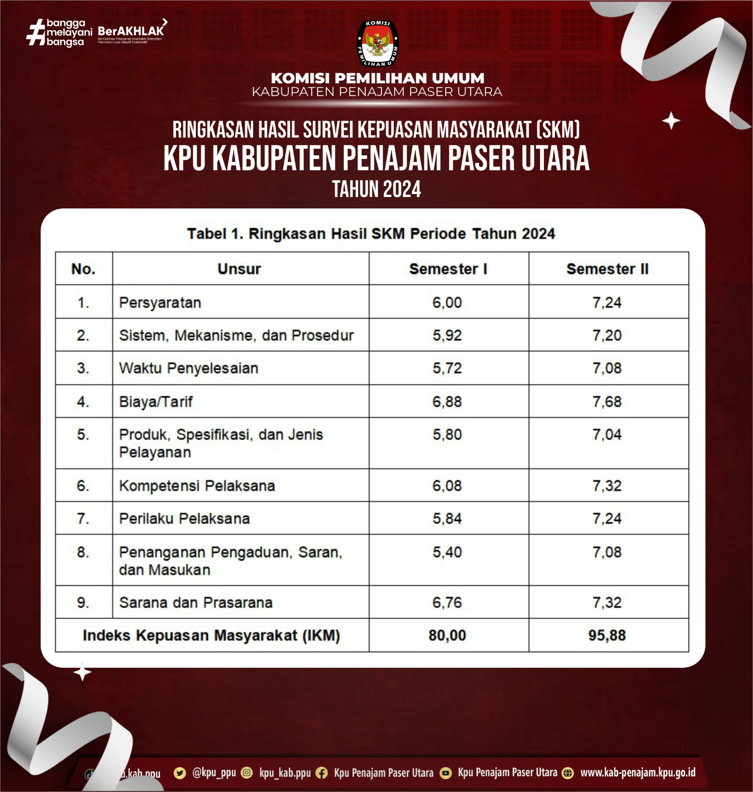 Berikut Ringkasan Hasil Survei Kepuasan Masyarakat (SKM) KPU Kabupaten Penajam Paser Utara Tahun 2024.