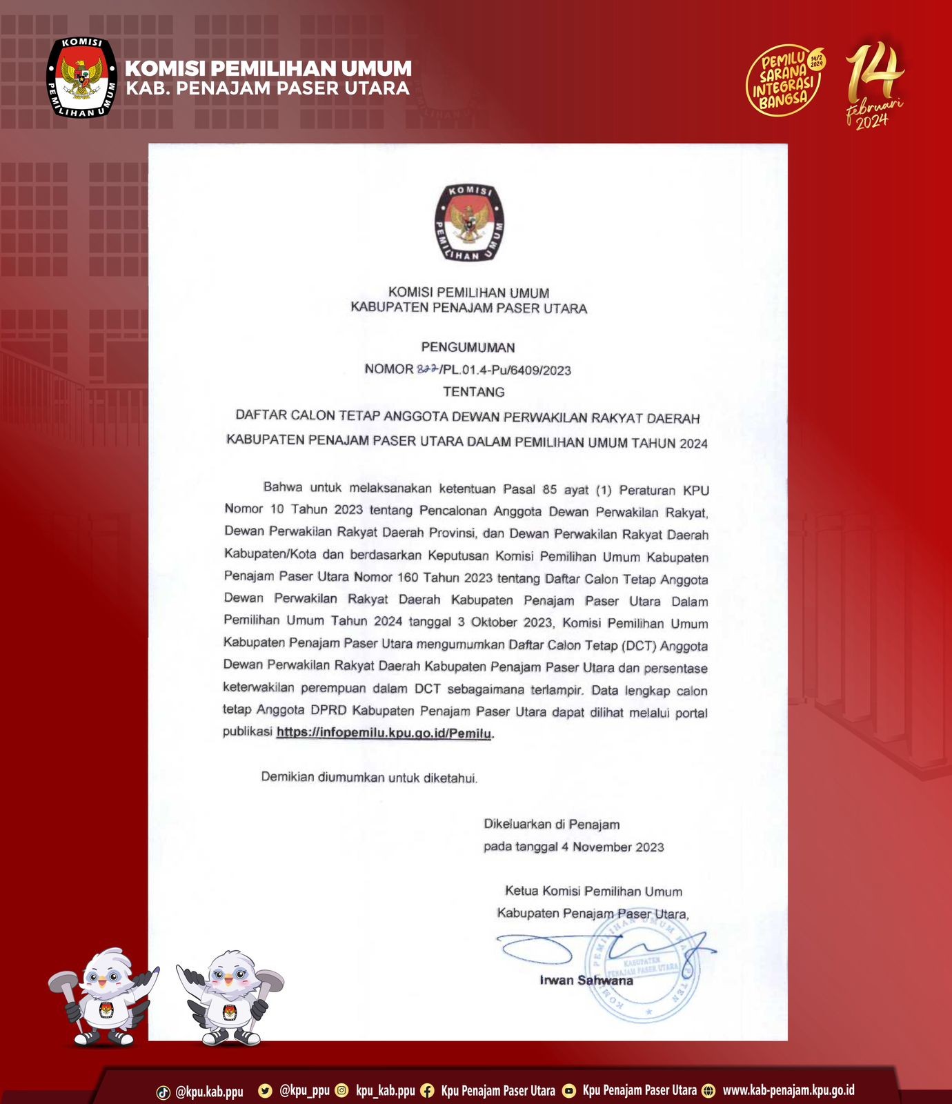 Pengumuman Penetapan Daftar Calon Tetap (DCT) Anggota Dewan Perwakilan Rakyat Daerah Kab. Penajam Paser Utara
