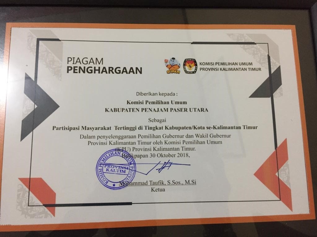 PENAJAM – Komisi Pemilihan Umum (KPU) Penajam Paser Utara kembali meraih penghargaan berupa Piagam Penghargaan terkait Partisipasi Masyarakat (Parmas) Tertinggi di Tingkat Kabupaten/Kota se-Kalimantan Timur Dalam Penyelenggaraan Pemilihan Gubernur dan Wakil Gubernur Provinsi Kalimantan Timur. Piagam Penghargaan tersebut diberikan langsung oleh Ketua KPU Provinsi Kalimantan Timur, Muhammad Taufik kepada Ketua KPU Kabupaten Penajam Paser Utara, Feri Mei Efendi di sela-sela Rapat Pimpinan Dalam Rangka Evaluasi dan Pelaporan Tahapan Pilgub Kaltim tahun 2018 di Hotel Senyiur, Balikpapan, Minggu (28/10/2018) Ketua Kpu Kabupaten PPU, Feri Mei Efendi mengatakan, penghargaan tersebut merupakan jerih payah semua pihak, termasuk kesadaran masyarakat PPU yang makin matang dan mengerti akan peran sertanya dalam pesta demokrasi. “Syukur alhamdulillah. Penghargaan ini kami persembahkan untuk masyarakat PPU dan petugas kami mulai dari KPU PPU, PPK, PPS, KPPS, relawan demokrasi dan semua pihak yang turut serta dalam proses pilkada serentak kemarin,” kata Feri yang juga menjabat Kepala Divisi Sosialisasi SDM Parmas, Senin (29/10/2018). Menurutnya, pola sosialisasi dan pendidikan pemilih harus dilakukan secara kesinambungan dan kreatif. “Ya tentu banyak formula, tidak hanya sosialisasi dan pendidikan pemilih di dalam ruangan saja, namun juga di luar ruangan. Pola sosdiklih ini terus dilakukan secara kontinuitas dan terprogram, agar masyarakat makin sadar akan pentingnya peran serta dalam kepemiluan, baik sebagai pemilih maupun rela menjadi petugas pemilu,” tambah Feri. Saat ini, pihaknya terus melakukan sosialisasi dan pendidikan pemilih kepada masyarakat dari berbagai segmen. “Sosialisasi dan pendidikan pemilih jelang Pemilu 2019 terus kita lakukan, nisalnya sosdiklih ke pemilih pemula hingga dalam waktu dekat kita akan gelar Kursus Singkat Kepemiluan,” jelas Feri. (ppid/kpuppu).