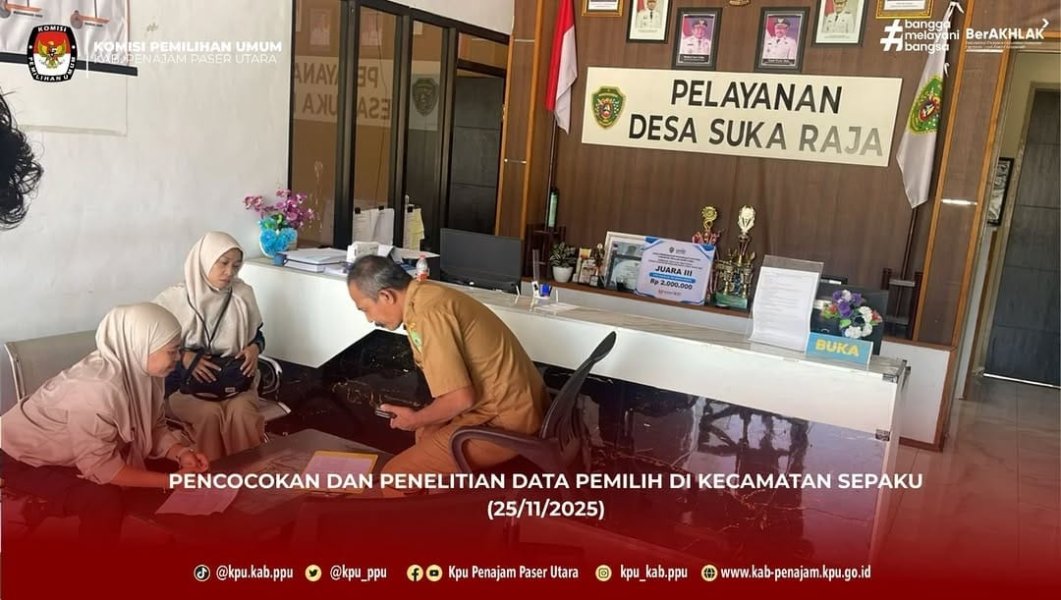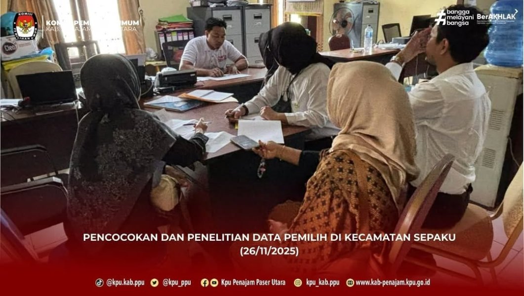 Hari Kedua Pelaksanaan COKTAS: KPU Kabupaten Penajam Paser Utara Lanjutkan Pencocokan & Penelitian Data Pemilih di Kecamatan Penajam #TemanPemilih, KPU Kabupaten Penajam Paser Utara melanjutkan Pencocokan dan Penelitian Terbatas (COKTAS) terhadap Data Penduduk Potensial Pemilih Pemilihan (DP4) Semester II Tahun 2025 sebagai bagian dari Pemutakhiran Data Pemilih Berkelanjutan (PDPB) 2025. Kegiatan ini dilaksanakan pada Rabu, 26 November 2025 di Kecamatan Penajam. Pada hari kedua COKTAS, dilakukan pengecekan terhadap 10 data, dengan rincian: • Kelurahan Riko — 1 data tidak ditemukan • Kelurahan Gersik — 1 data sudah pindah • Kelurahan Buluminung — 2 data (1 terkonfirmasi di luar negeri, 1 tidak diketahui) • Kelurahan Nenang — 2 data sudah pindah • Kelurahan Penajam — 1 data sudah pindah • Desa Girimukti — 3 data (2 terkonfirmasi sebagai warga Girimukti, 1 tidak ditemukan) Pelaksanaan COKTAS merupakan bentuk komitmen KPU untuk memastikan data pemilih yang akurat, mutakhir, dan berkualitas. Agar Data Pemilih Semakin Valid! Bagi #TemanPemilih yang mengalami perubahan elemen kependudukan (alamat, status, NIK, dan lainnya) atau belum terdaftar sebagai pemilih, dapat melapor melalui: Media sosial resmi KPU Kabupaten Penajam Paser Utara Datang langsung ke Kantor KPU Kabupaten Penajam Paser Utara Partisipasi Anda sangat penting untuk mewujudkan data pemilih yang lebih akurat, valid, dan berintegritas. #KPU #KPUPPU #PPU #COKTAS2025 #PDPB2025 #Pemilu #DataPemilih #KPUKabupatenPenajamPaserUtara