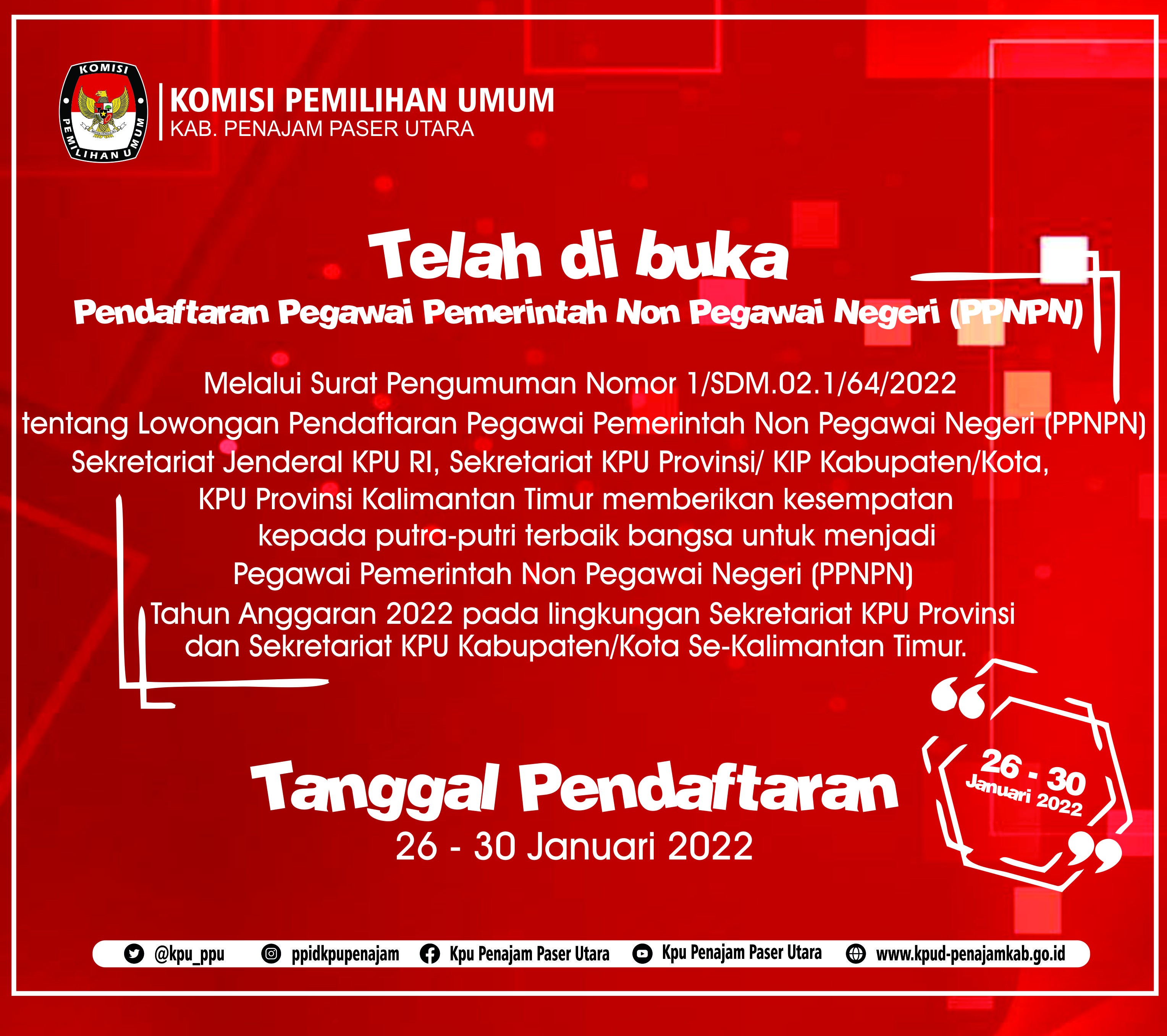 PenajamKPUD - Melalui Surat Pengumuman Nomor 1/SDM.02.1/64/2022 tentang Lowongan Pendaftaran Pegawai Pemerintah Non Pegawai Negeri (PPNPN) Sekretariat Jenderal KPU RI, Sekretariat KPU Provinsi/ KIP Kabupaten/Kota, KPU Provinsi Kalimantan Timur memberikan kesempatan kepada putra-putri terbaik bangsa untuk menjadi Pegawai Pemerintah Non Pegawai Negeri (PPNPN) Tahun Anggaran 2022 pada lingkungan Sekretariat KPU Provinsi dan Sekretariat KPU Kabupaten/Kota Se-Kalimantan Timur.